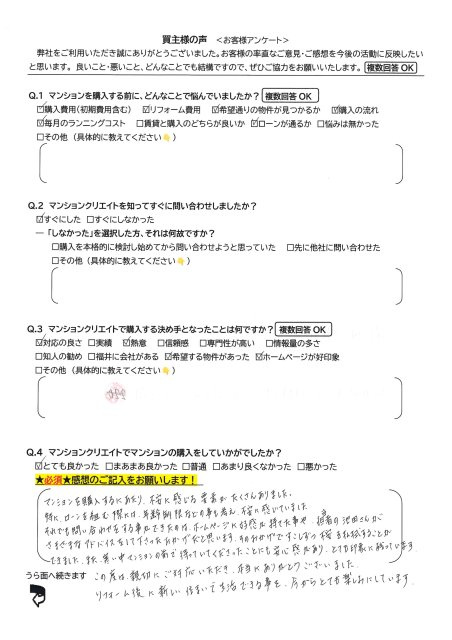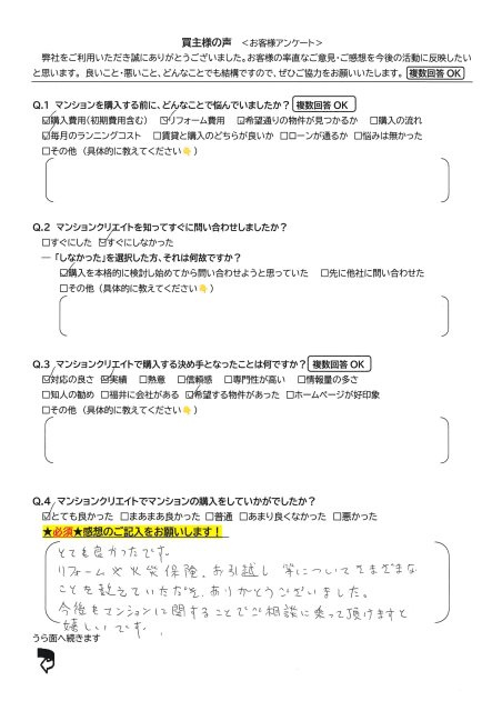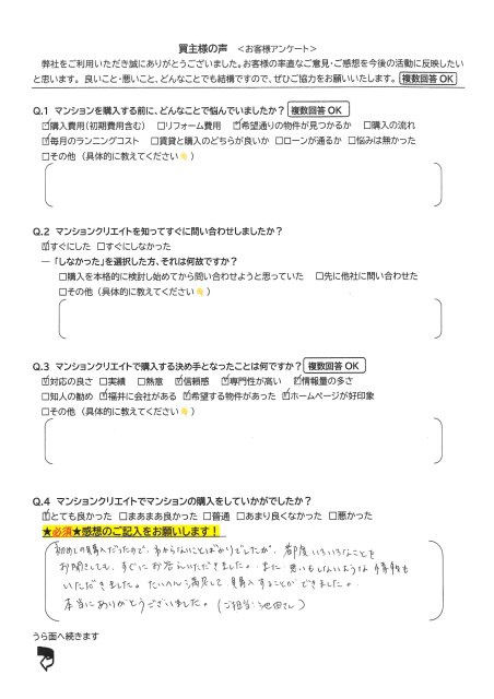 とても良かった。マンションを購入するにあたり、不安に感じる要素がたくさんありました。特に、ローンを組む際には、年齢制限などのことも考え不安に感じていました。それでも問い合わせをする事ができたのは、ホームページに好感が持てたことや、担当者の池田さんがさまざまなアドバイスをして下さったおかげだと思います。そのおかげで少しずつ不安を払拭することができました。また、寒い中マンションの前で待っていてくださったことにも安心感があり、とても印象に残っています。この度は、親切にご対応いただき、本当にありがとうございました。リフォーム後に新しい住まいで生活できることを、今からとても楽しみにしています。